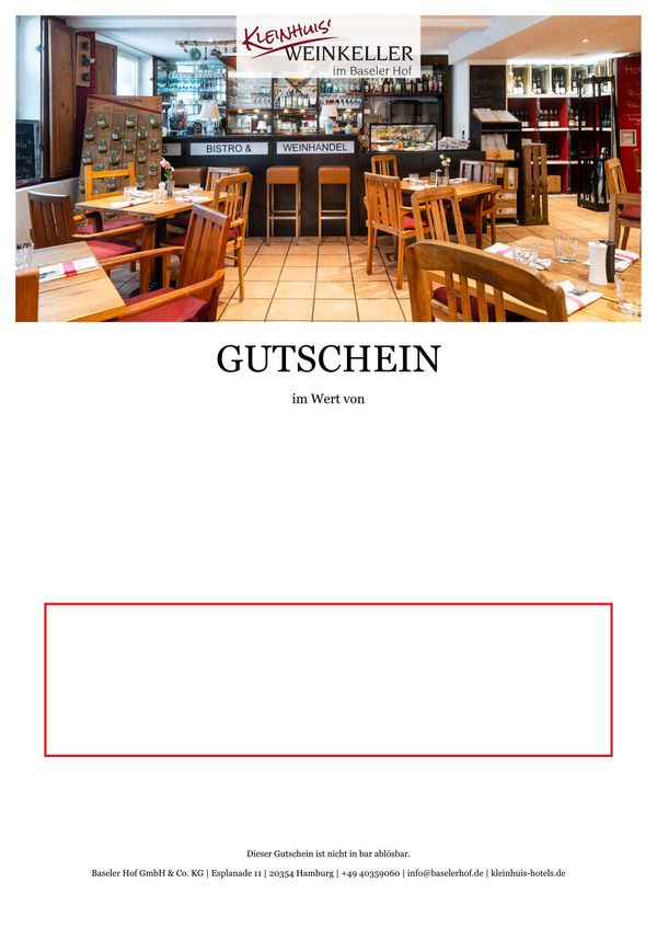 Der Wertgutschein für den Kleinhuis' Weinkeller ist das perfekte Geschenk für jeden Anlass! Verschenken Sie gemeinsame Erlebnisse und genießen Sie einen Aperitivo in gemütlicher Atmosphäre mitten in der Hamburger Innenstadt.
